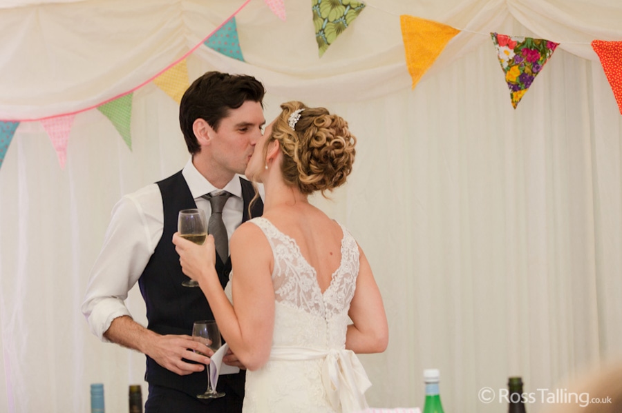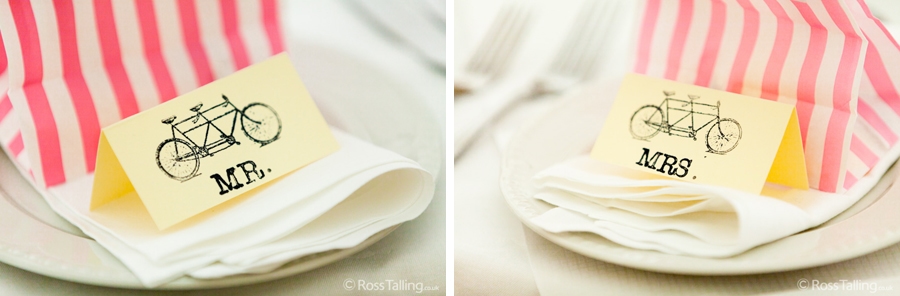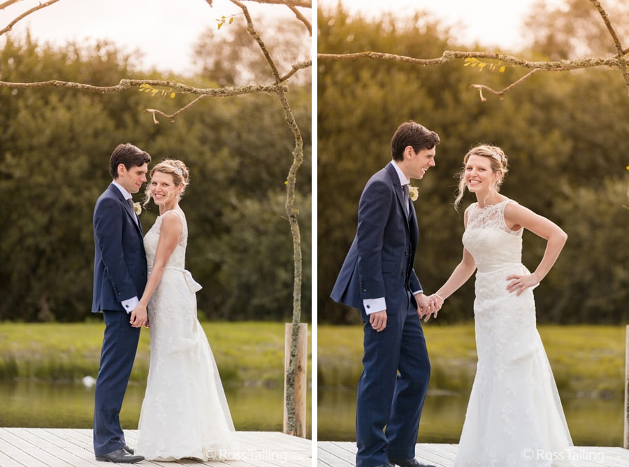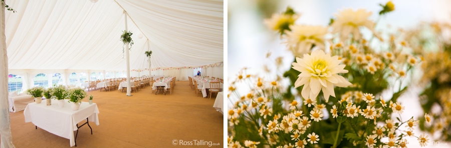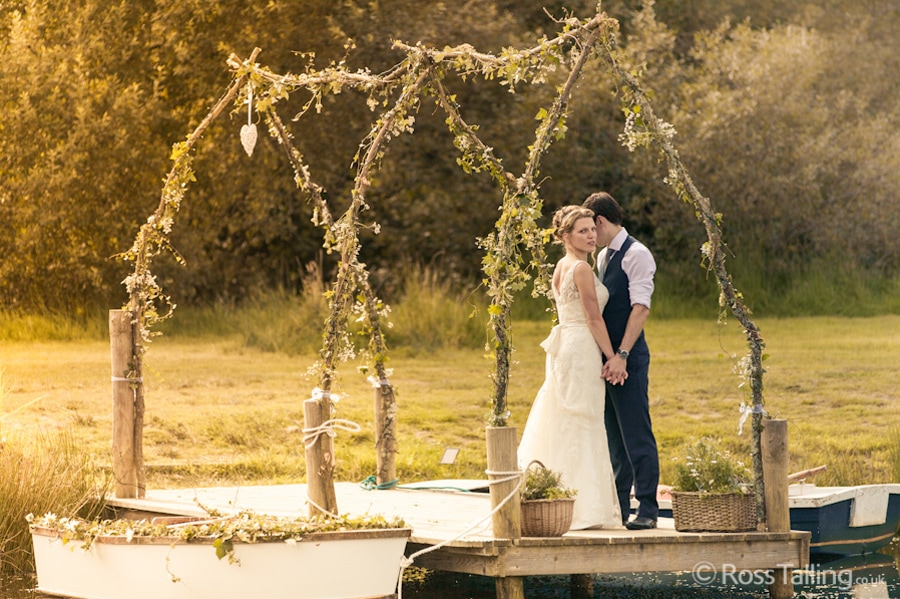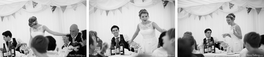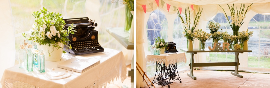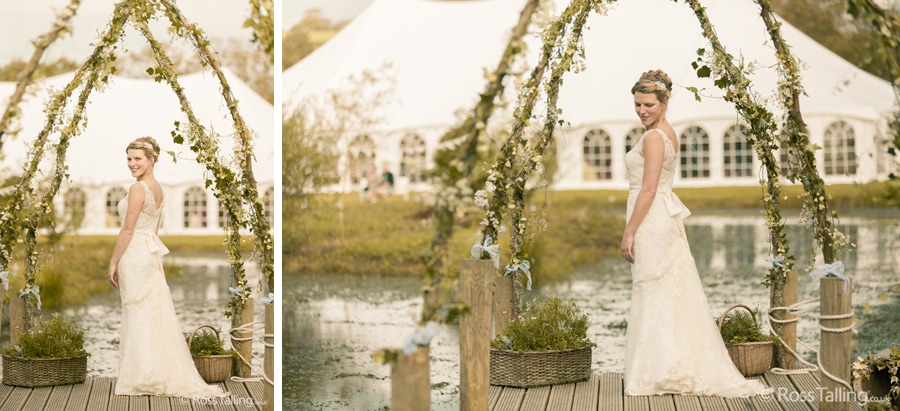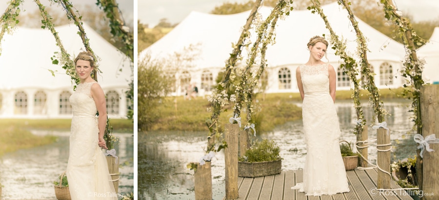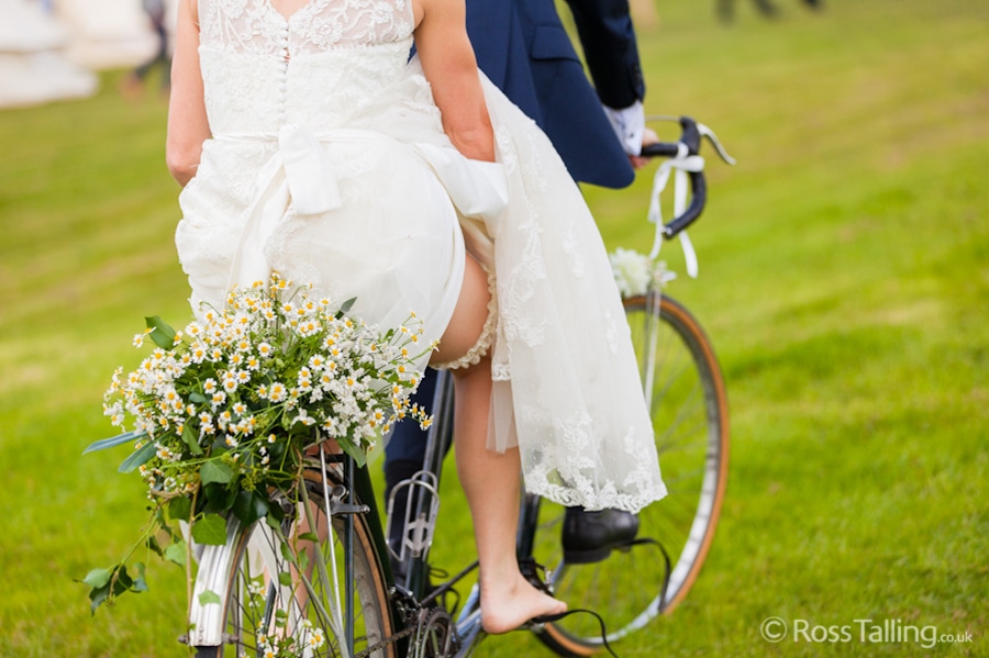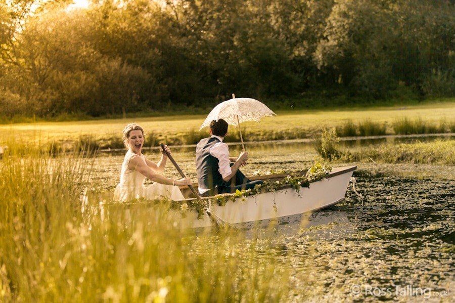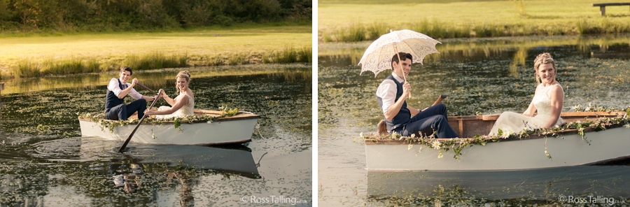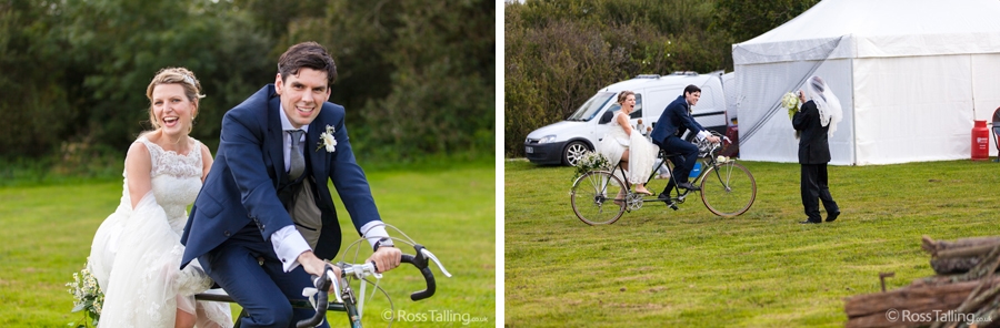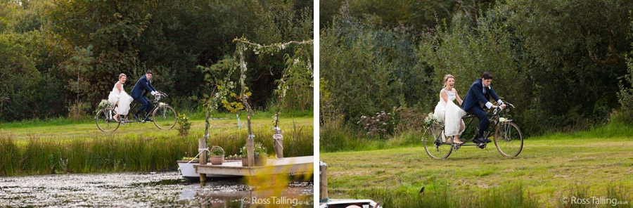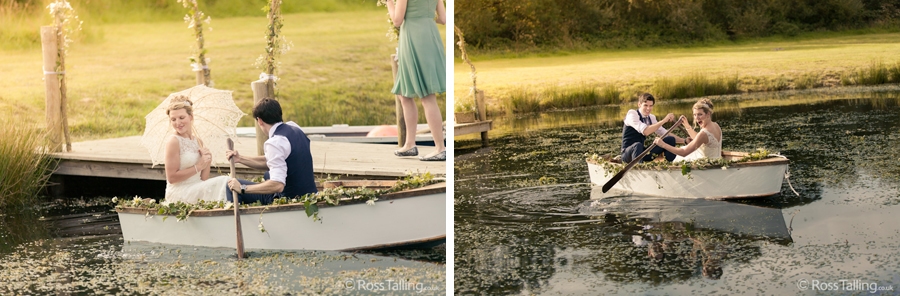 After the ceremony we only had to go around the corner for the reception to Jo’s parent’s very secluded camp site, Pleasant Streams Farm (which is available to hire for weddings) where they had a huge marquee (Coast2Coast Marquees) next to a beautiful lake. The whole place looked wonderful, all the flowers, decorations and the cake where done by Jo’s sister Kristy (Kristy Lou’s Flowers – 01726 76811), she must have been rushed off her feet in the run up to the big day, great job Kristy! Jo and Roger did a few laps riding around the lake on the vintage tandem bike they had borrowed for the day, I cant quite believe Jo managed that in her dress, brilliant! And then after mingling with the guests for a while, it was more exercise, rowing around the lake in a boat, decorated with flowers of course.