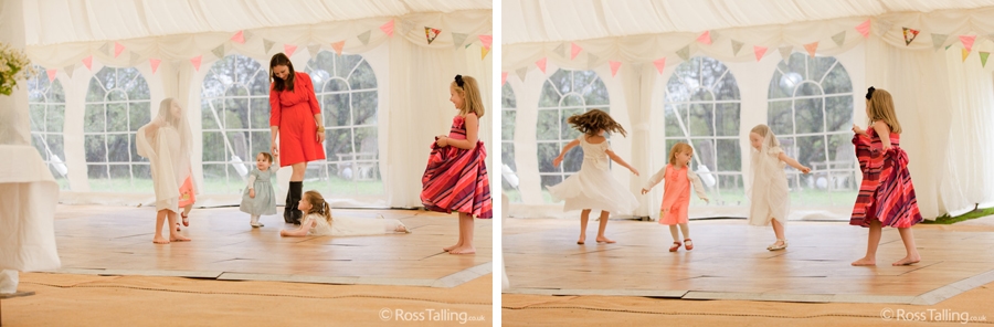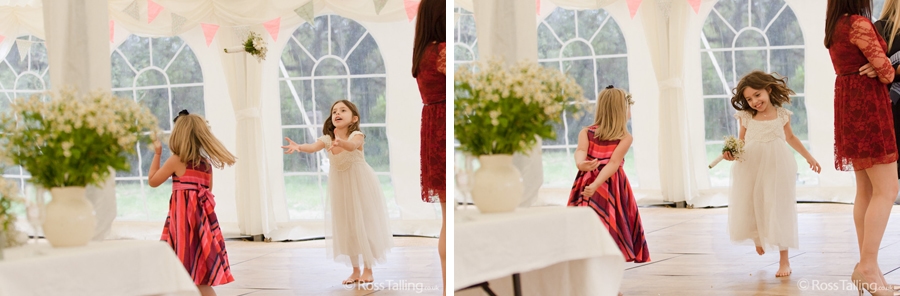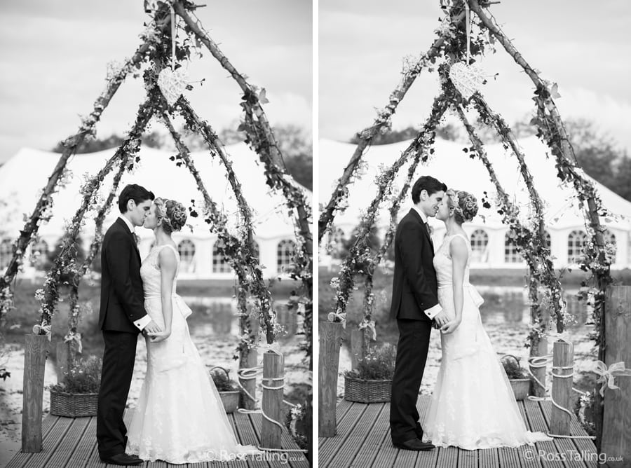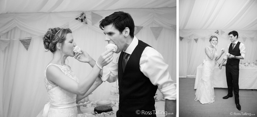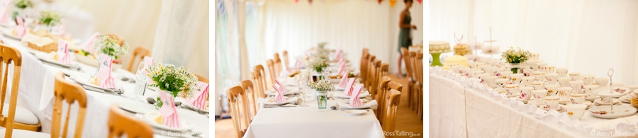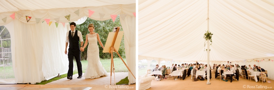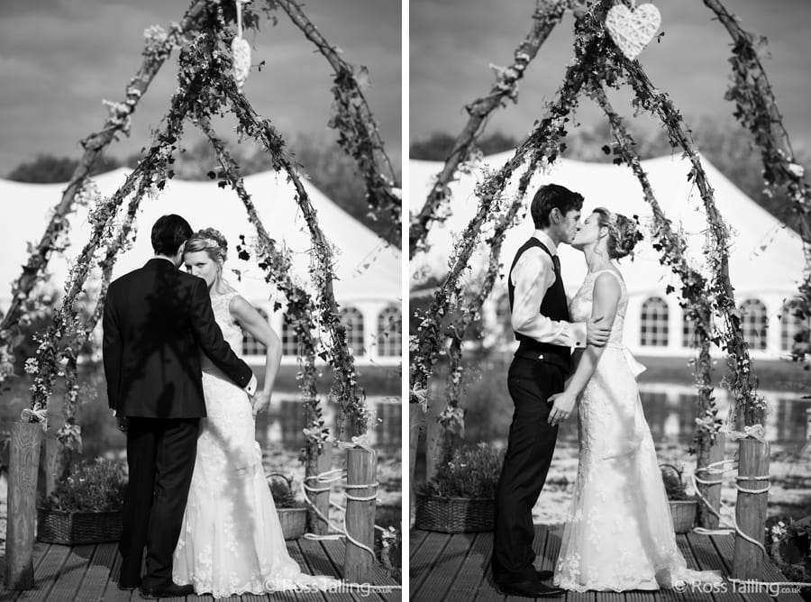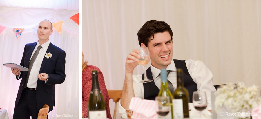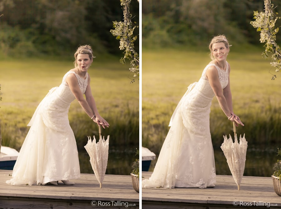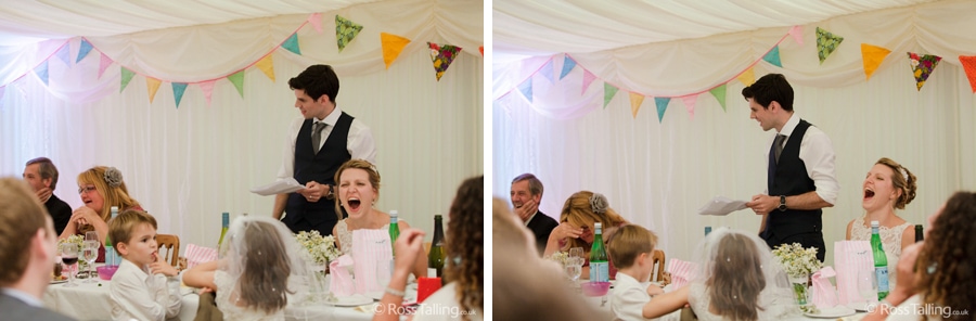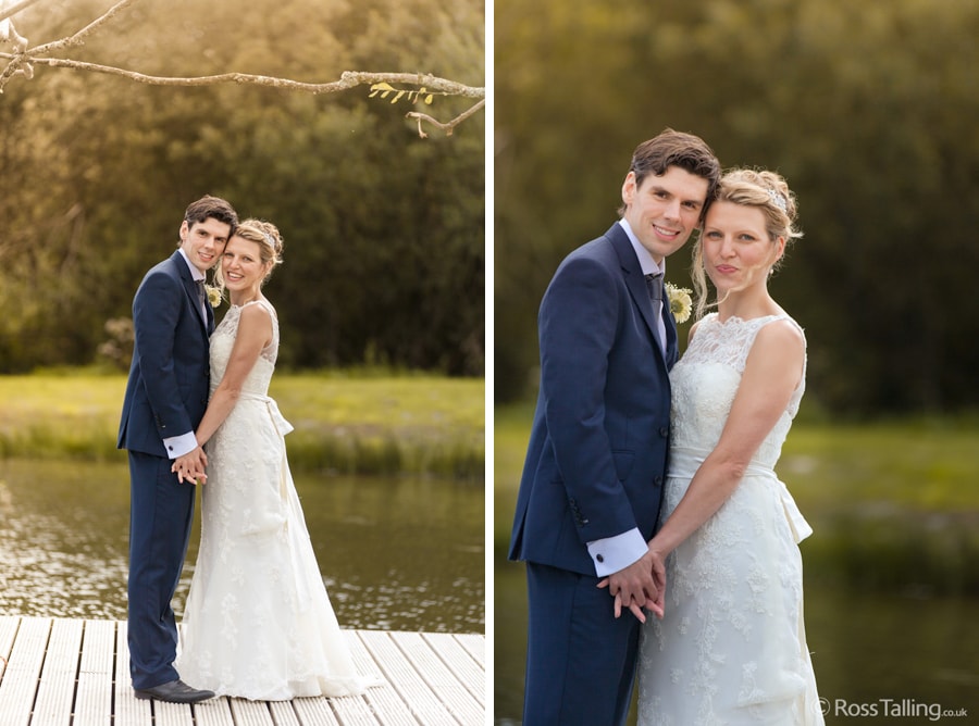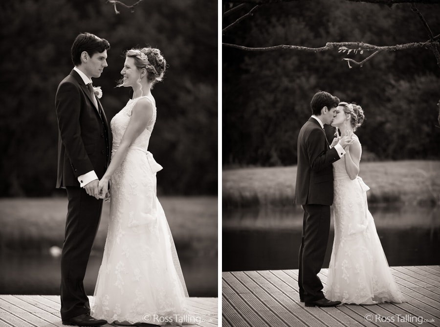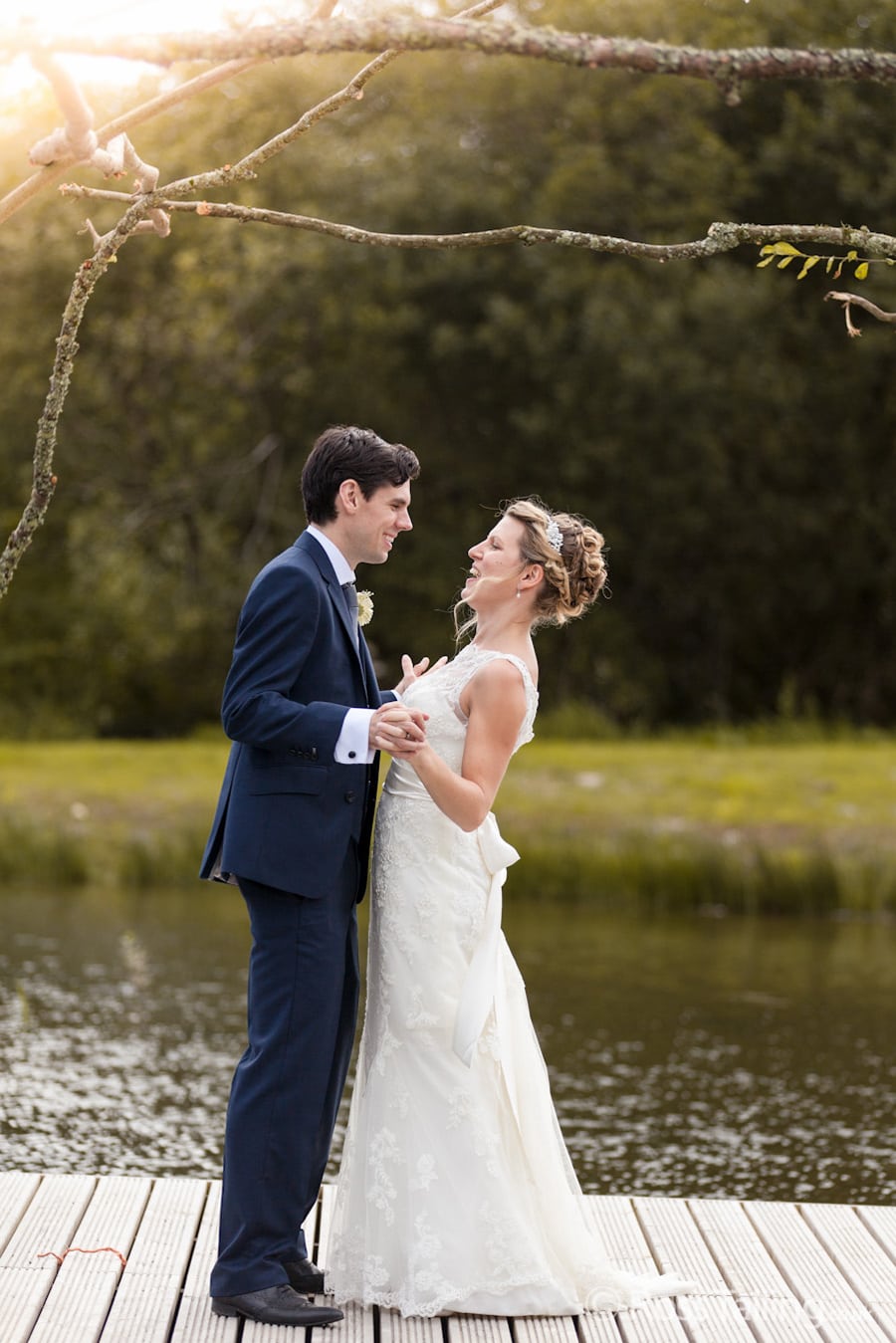 After the ceremony we only had to go around the corner for the reception to Jo’s parent’s very secluded camp site, Pleasant Streams Farm (which is available to hire for weddings) where they had a huge marquee (Coast2Coast Marquees) next to a beautiful lake. The whole place looked wonderful, all the flowers, decorations and the cake where done by Jo’s sister Kristy (Kristy Lou’s Flowers – 01726 76811), she must have been rushed off her feet in the run up to the big day, great job Kristy! Jo and Roger did a few laps riding around the lake on the vintage tandem bike they had borrowed for the day, I cant quite believe Jo managed that in her dress, brilliant! And then after mingling with the guests for a while, it was more exercise, rowing around the lake in a boat, decorated with flowers of course.